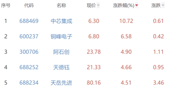其中,中芯集成、铜峰电子、阿石创、天德钰、天岳先进位列板块涨幅前五位,涨幅分别为10.72%、6.58%、4.90%、4.66%、4.51%。