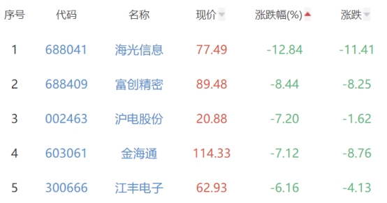 海光信息、富创精密、沪电股份、金海通、江丰电子位列涨幅榜后五位,涨幅分别为-12.84%、-8.44%、-7.20%、-7.12%、-6.16%。