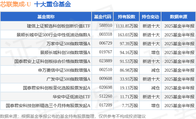 根据2025基金半年报公募基金重仓股数据,重仓该股的公募基金共15家,其中持有数量最多的公募基金为建信基金的建信上证智选科创板创新价值ETF。建信上证智选科创板创新价值ETF目前规模为7.97亿元,最新净值1.2912(9月25日),较上一交易日上涨0.09%。该公募基金现任基金经理为张溢麟。张溢麟在任的基金产品包括:建信民丰回报混合,管理时间为2023年1月4日至今,期间收益率为5.65%;建信双债增强债券A,管理时间为2024年6月27日至今,期间收益率为5.39%;建信上证智选科创板创新价值ETF联接A,管理时间为2025年6月20日至今,期间收益率为16.97%。
