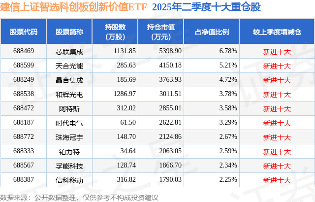 建信上证智选科创板创新价值ETF的前十大重仓股如下: