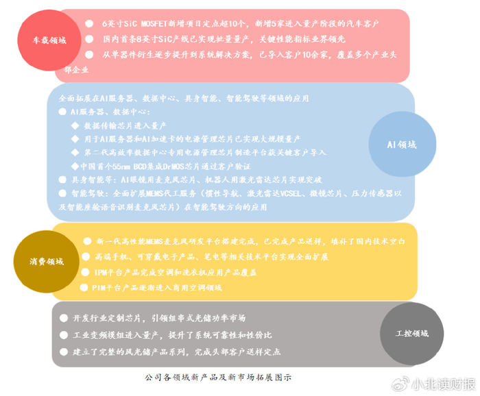 作为中国最大的车规级IGBT生产基地之一,公司确立了“功率半导体+模拟IC+MEMS传感器”三大技术方向和“汽车+工控+消费+AI”四大应用市场的发展战略。
