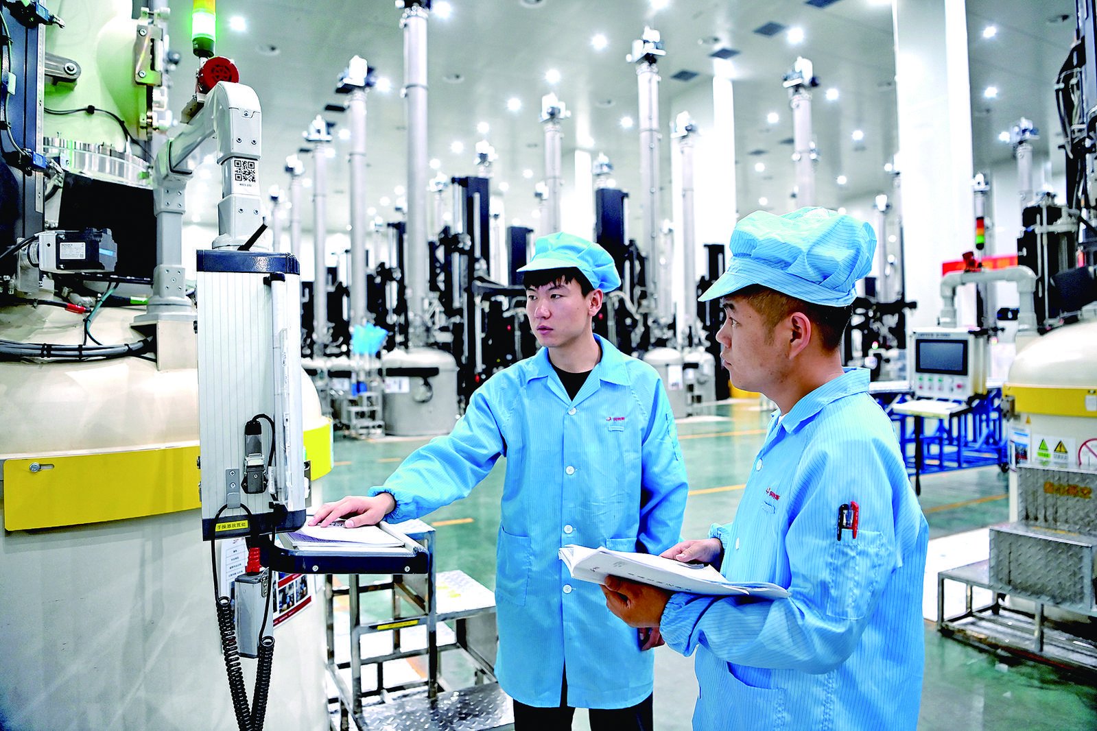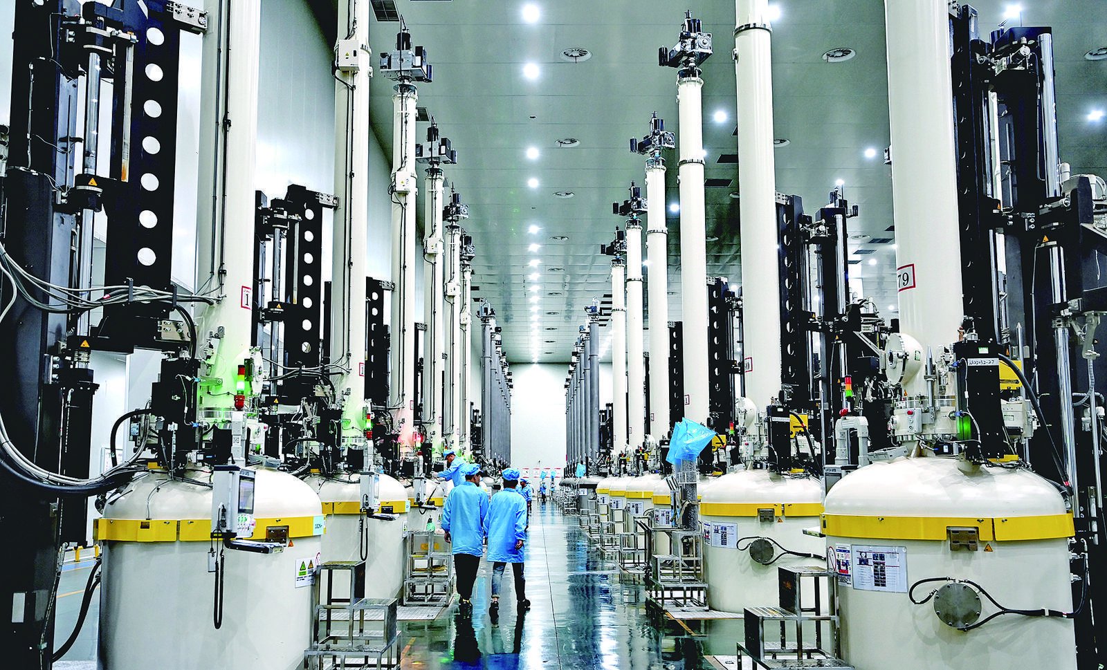 “年产10GW单晶拉棒”项目开工建设以来,一期二期项目均已建成达产。目前已形成年产10GW单晶拉棒生产能力。这是生产车间技术人员正在作业(7月27日摄)。