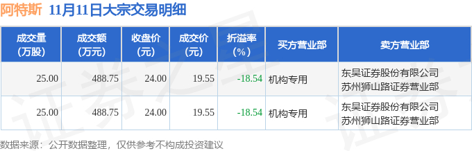 11月11日阿特斯现2笔折价18.54%的大宗交易 合计成交977.5万元