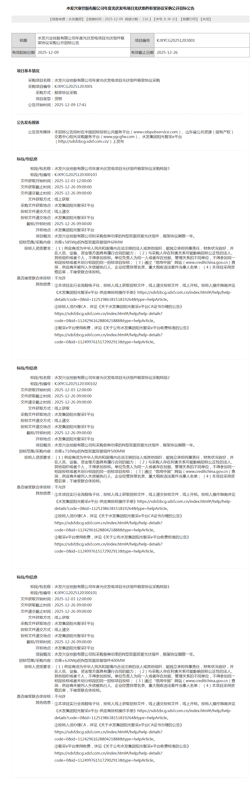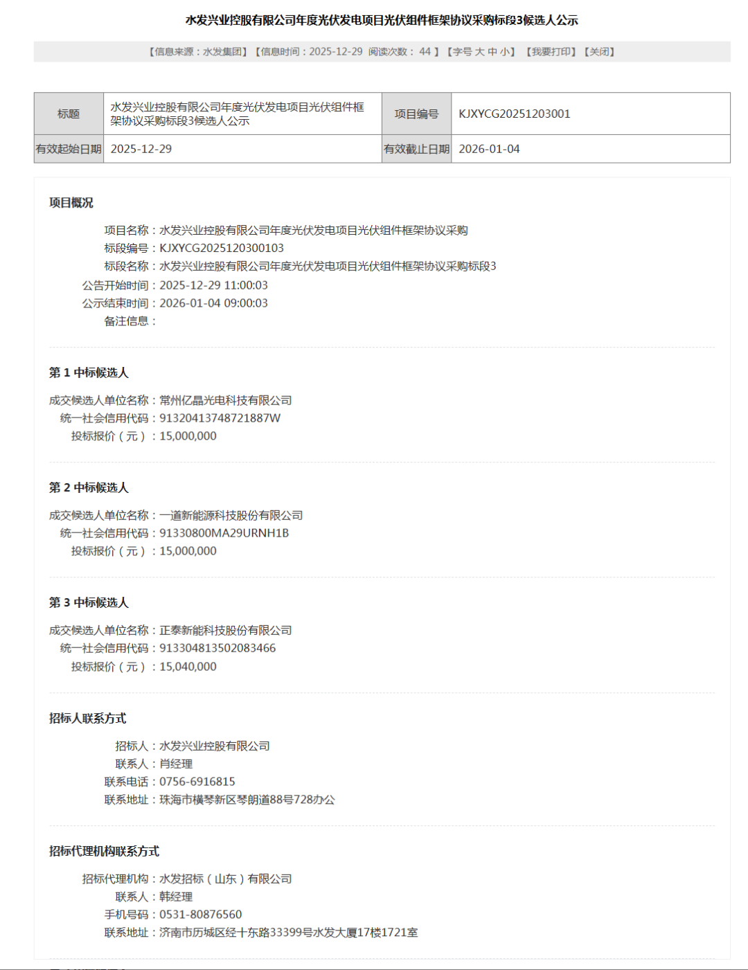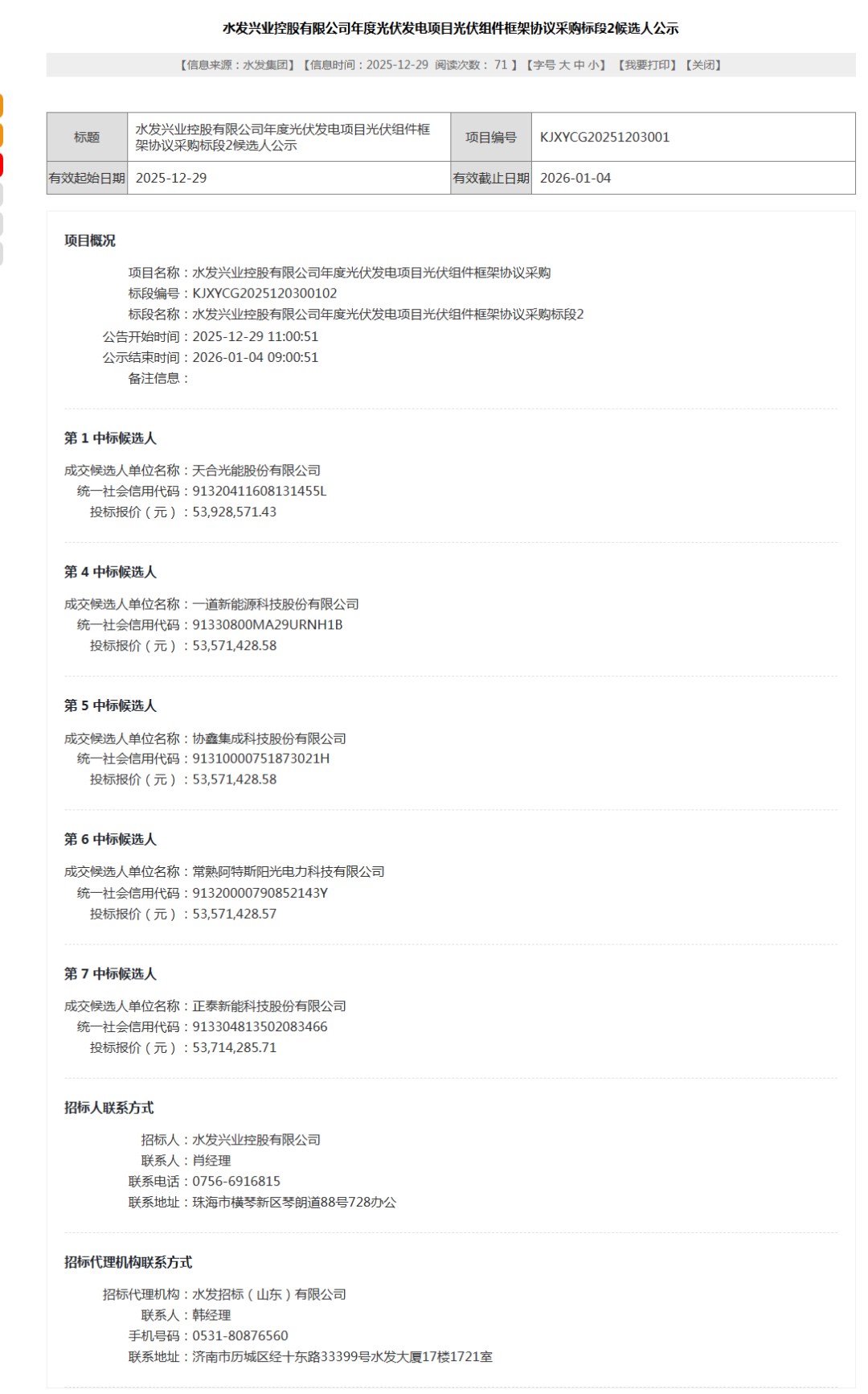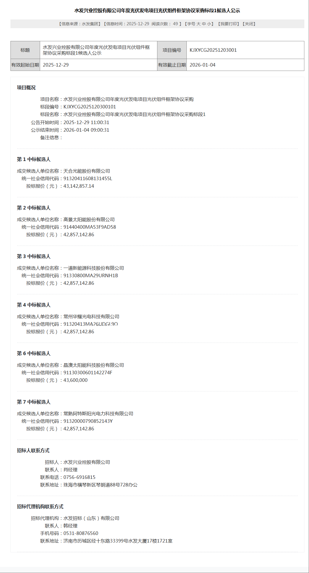 12月29日,水发兴业控股有限公司年度光伏发电项目光伏组件框架协议采购候选人公示。