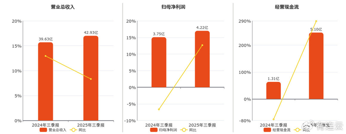 公司营业总收入为42.93亿元,较去年同报告期营业总收入增加3.30亿元,实现4年连续上涨,同比较去年同期上涨8.33%。归母净利润为4.22亿元,较去年同报告期归母净利润增加4753.65万元,同比较去年同期上涨12.68%。经营活动现金净流入为5.10亿元,较去年同报告期经营活动现金净流入增加3.79亿元,同比较去年同期上涨288.91%。