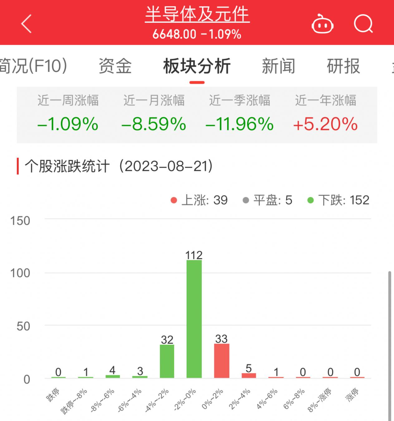 中国经济网北京8月21日讯 今日,半导体及元件板块整体跌幅1.09%,其中39只股票上涨,5只股票平盘,152只股票下跌。