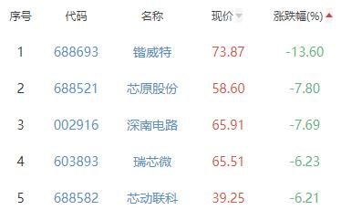 锴威特、芯原股份、深南电路、瑞芯微、芯动联科位列涨幅榜后五位,涨幅分别为-13.60%、-7.80%、-7.69%、-6.23%、-6.21%。