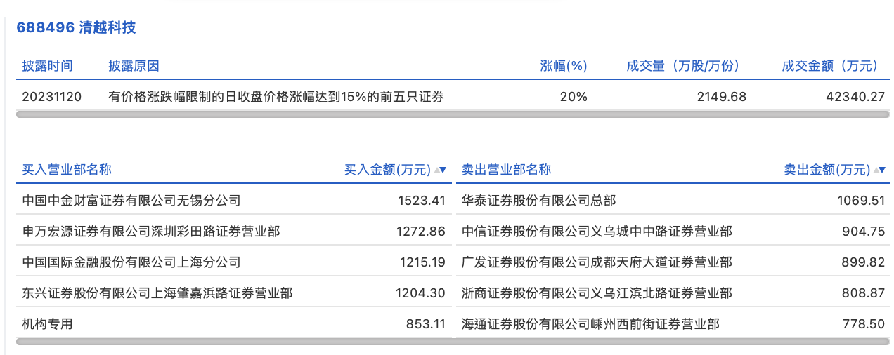 11月20日,清越科技今日涨停,全天换手率达26.03%,振幅达14.22%。龙虎榜数据显示,营业部席位合计净买入1607.4万元。其中,机构合计净买入853.11万元。此外,中国中金财富证券有限公司无锡分公司、申万宏源证券有限公司深圳彩田路证券营业部分别买入1523.41万元、1272.86万元;华泰证券总部、中信证券义乌城中中路证券营业部分别卖出1069.51万元、904.75万元。