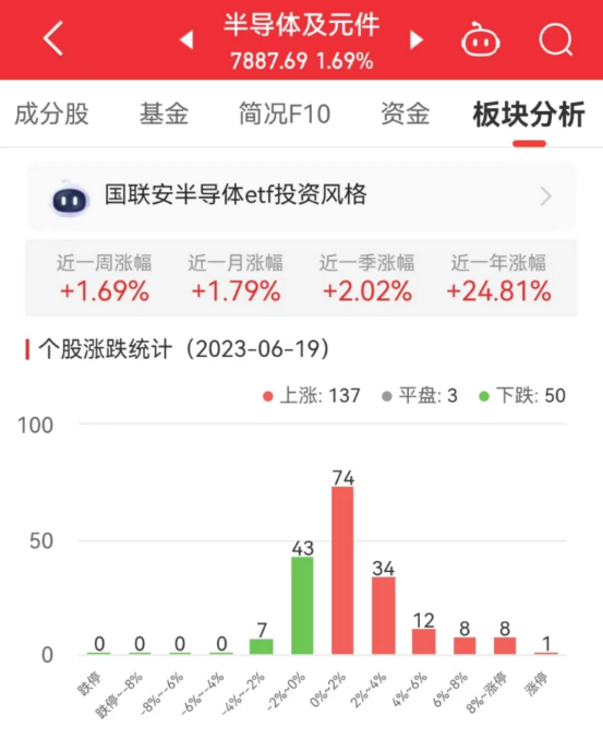中国经济网北京6月19日讯今日,半导体及元件板块整体涨幅1.69%,其中137只股票上涨,3只股票平盘,50只股票下跌。