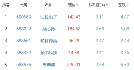法拉电子、纳芯微、和林微纳、颀中科技、思瑞浦位列涨幅榜后五位,涨幅分别为-3.11%、-2.68%、-2.47%、-2.41%、-2.38%。