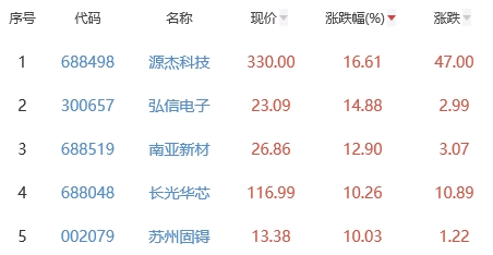 其中,源杰科技、弘信电子、南亚新材、长光华芯、苏州固锝位列板块涨幅前五位,涨幅分别为16.61%、14.88%、12.90%、10.26%、10.03%。