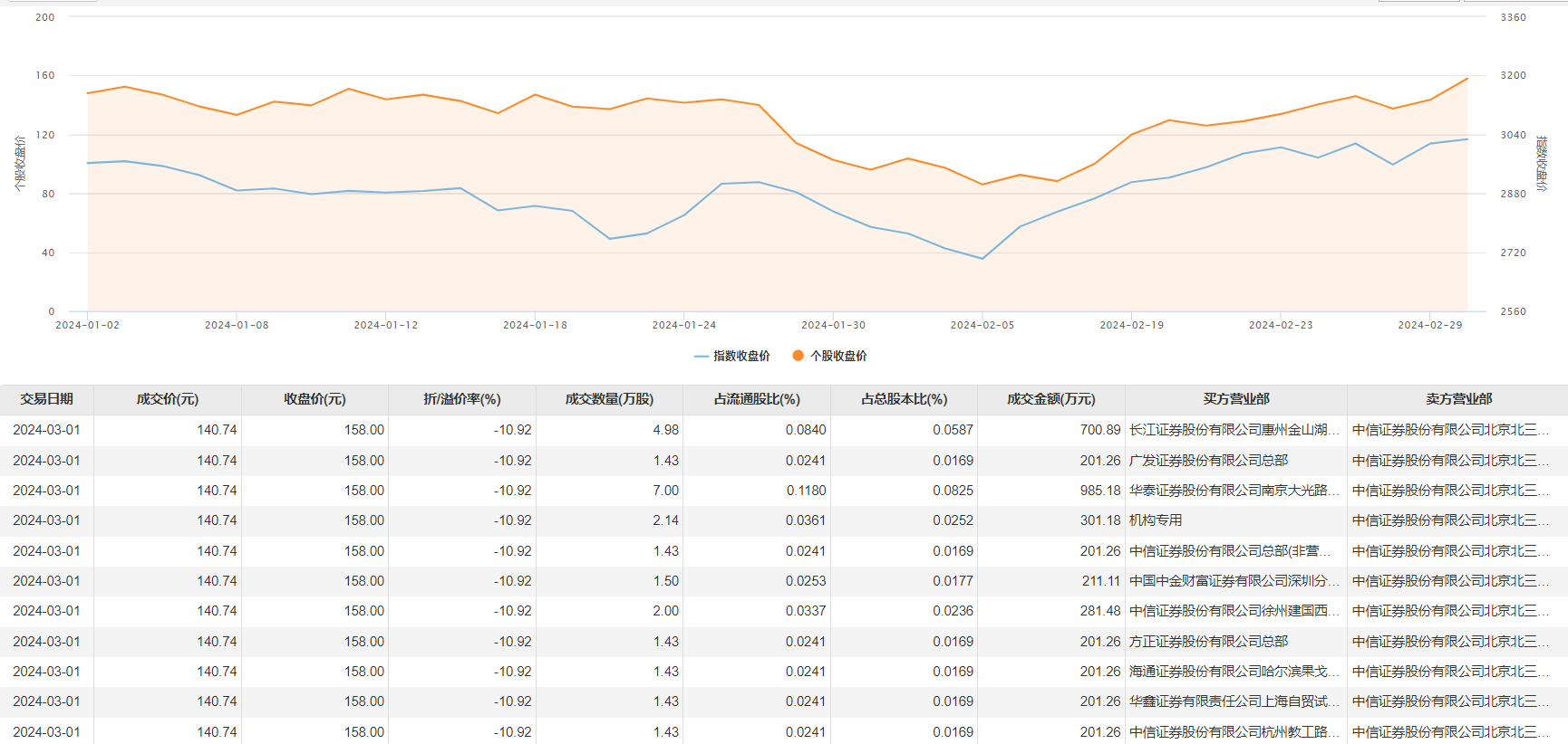 3月1日大宗交易成交26.2万股,成交额3687.4万元,占当日总成交额的3.7%,成交价140.74元,较市场收盘价158元折价10.92%。