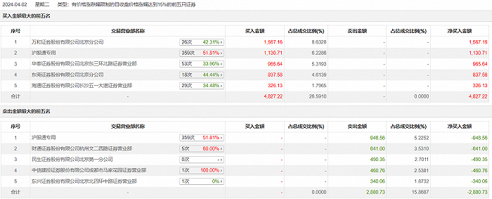 利元亨4月2日涨停,龙虎榜数据显示,上榜营业部席位全天成交7707.96万元,占当日总成交金额比例为42.46%。其中,买入金额为4827.23万元,卖出金额为2880.73万元,合计净买入1946.5万元。