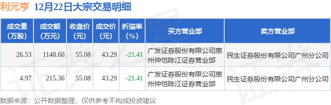 12月22日利元亨现2笔折价21.41%的大宗交易 合计成交1363.96万元