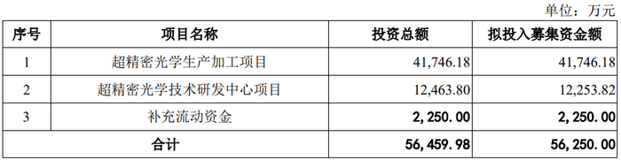 公司本次向不特定对象发行可转换公司债券拟募集资金总额不超过56,250.00万元(含56,250.00万元),扣除发行费用后募集资金净额将用于超精密光学生产加工项目、超精密光学技术研发中心项目、补充流动资金。