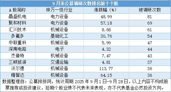 机构来看,9月来85家公募机构调研表现积极,调研次数均不少于20次,其中28家公募机构调研尤为积极,调研次数均不少于50次。