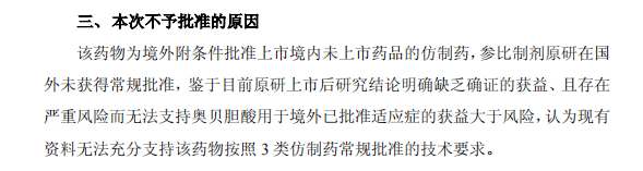 更为关键的是,“目前原研上市后研究结论明确缺乏确证的获益且存在严重风险”,无法支持奥贝胆酸用于境外已批准适应症的获益大于风险。基于这一判断,国家药监局认为现有资料无法充分支持该药物按照3类仿制药常规批准的技术要求。