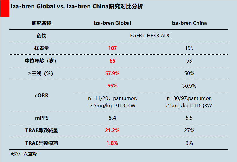 与国内早期研究相比,Iza-bren Global研究的中位年龄为65岁,显著高于中国的53.5岁;更重要的是,全球研究中,接受过三线及以上治疗的患者比例高达57.9%,高于中国的50%。