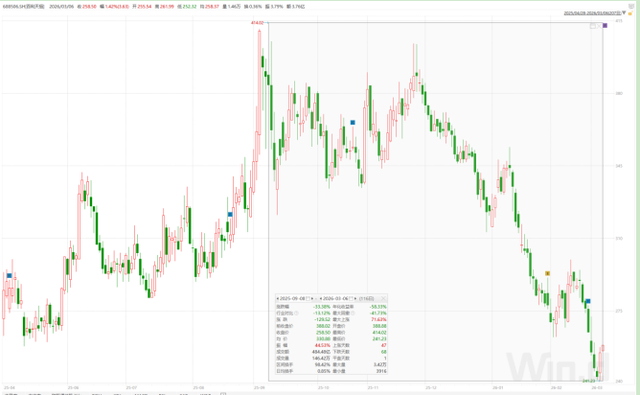 但二级市场对这次回购似乎“置之不理”,公司股价从2025年9月的历史高点414.02元/股,到如今徘徊在260元左右,市值蒸发近600亿元。