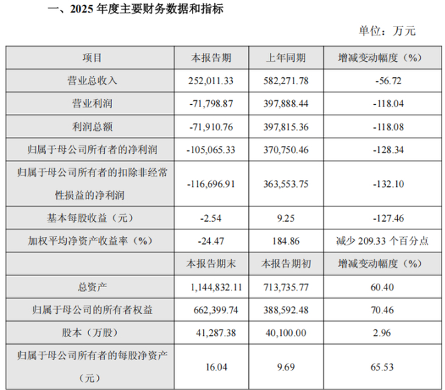 四川百利天恒药业股份有限公司(下称“百利天恒”,股票代码:688506.SH)于2026年2月28日发布2025年年度业绩快报公告。公告显示,公司在2025年实现营业总收入25.2亿元,较上年同期的58.23亿元减少56.72%;归属于母公司所有者的净利润为-10.51亿元,较上年同期的37.08亿元大幅转亏,同比减少128.34%。