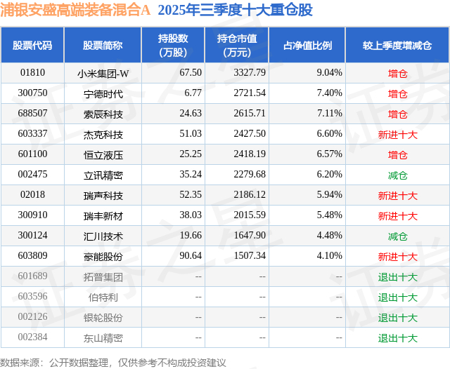 浦银安盛高端装备混合A的前十大重仓股如下: