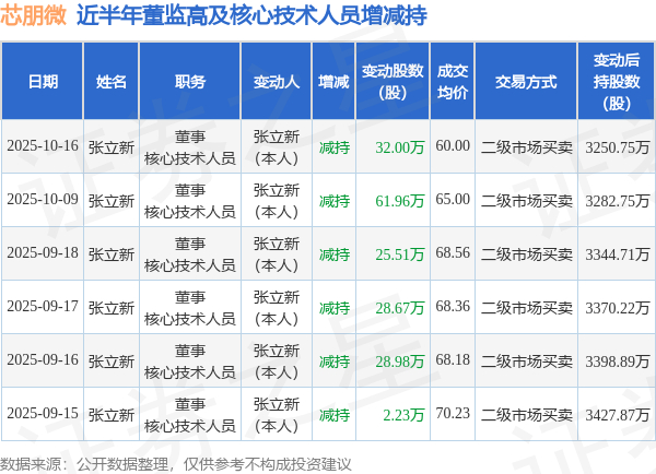 芯朋微:10月16日高管张立新减持股份合计32万股