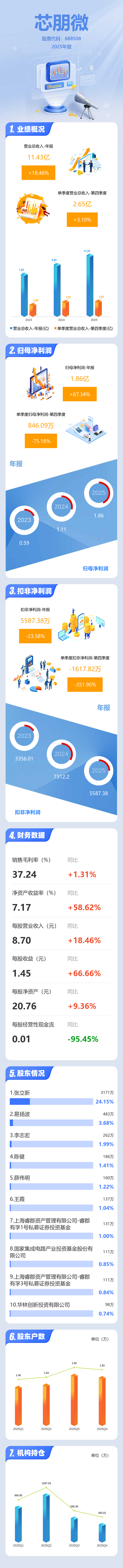 证券之星消息,芯朋微2025年年报显示,当年度公司主营收入11.43亿元,同比上升18.47%;归母净利润1.86亿元,同比上升67.34%;扣非净利润5587.38万元,同比下降23.59%;其中2025年第四季度,公司单季度主营收入2.65亿元,同比上升3.11%;单季度归母净利润846.09万元,同比下降75.18%;单季度扣非净利润-1617.82万元,同比下降351.91%;负债率17.61%,投资收益2199.53万元,财务费用195.58万元,毛利率37.24%。