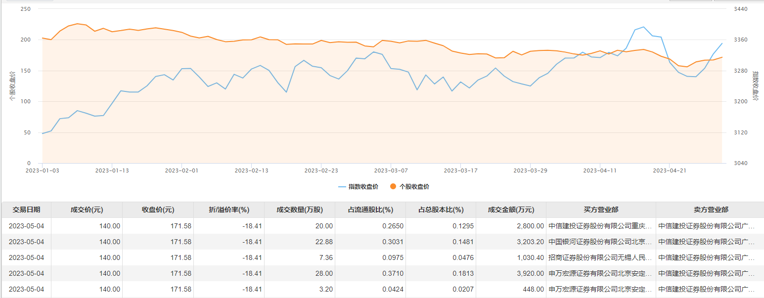 5月4日大宗交易成交81.44万股,成交额1.14亿元,占当日总成交额的29.9%,成交价140元,较市场收盘价171.58元折价18.41%。