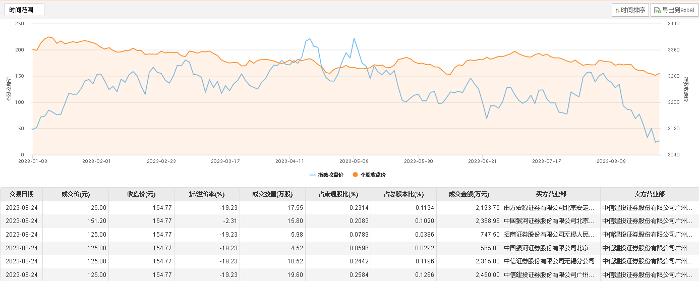 奥特维8月24日大宗交易成交81.97万股,成交额1.07亿元,占当日总成交额的43.61%,成交均价130.05元,较市场收盘价154.77元折价15.97%,其中最高成交价151.2元,最低成交价125元。