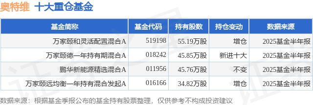 根据2025基金半年报公募基金重仓股数据,重仓该股的公募基金共4家,其中持有数量最多的公募基金为万家基金的万家颐和灵活配置混合A。万家颐和灵活配置混合A目前规模为2.68亿元,最新净值1.6358(10月16日),较上一交易日下跌0.12%,近一年上涨8.33%。该公募基金现任基金经理为章恒。章恒在任的基金产品包括:万家颐远均衡一年持有混合发起A,管理时间为2022年8月30日至今,期间收益率为-5.59%;万家颐德一年持有期混合A,管理时间为2023年5月5日至今,期间收益率为-2.34%。