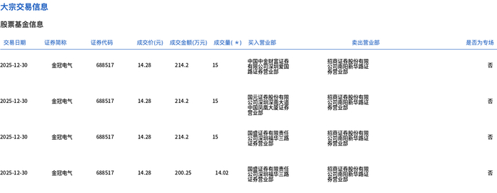 12月30日,金冠电气大宗交易成交79.02万股,成交额1128.45万元,占当日总成交额的23.94%,成交价14.28元,较市场收盘价15.67元折价8.87%。