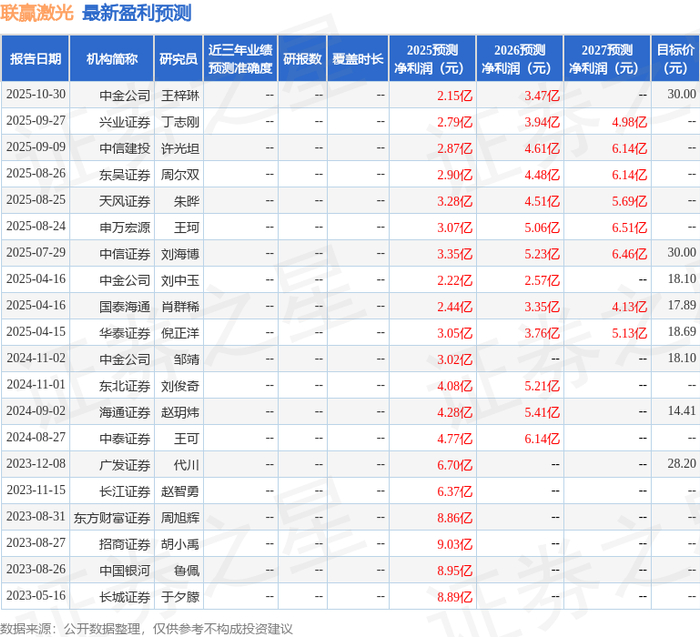 东吴证券股份有限公司周尔双,李文意近期对联赢激光进行研究并发布了研究报告《2025年三季报点评:Q3业绩环比明显改善,看好公司动力&3C业务快速增长:联》,给予联赢激光增持评级。
