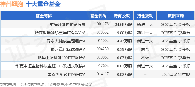 持有神州细胞最多的基金为前海开源再融资股票,目前规模为4.84亿元,最新净值1.429(10月31日),较上一交易日下跌0.07%,近一年上涨21.5%。该基金现任基金经理为邱杰。