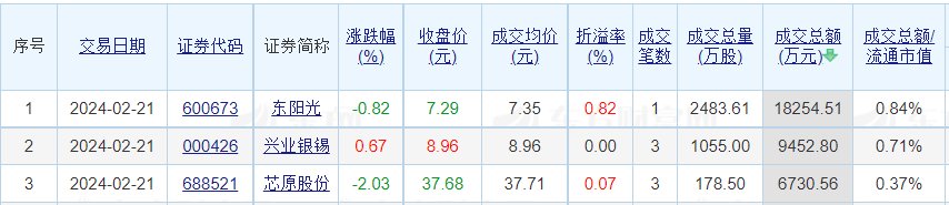 上证报中国证券网讯 据东方财富Choice数据,2月21日A股共59只个股发生大宗交易,总成交10.07亿元,其中东阳光、兴业银锡、芯原股份成交额居前,成交额依次为1.83亿元、9452.8万元、6730.56万元。