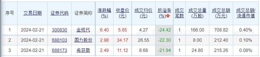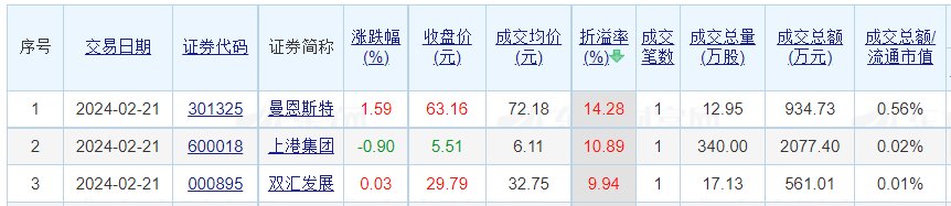 成交价方面,曼恩斯特、上港集团、双汇发展溢价率居前,溢价率依次为14.28%、10.89%、9.94%;金现代、国力股份、希荻微折价率居前,折价率依次为24.42%、22.3%、21.94%。
