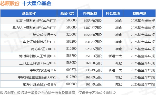 根据2025基金半年报公募基金重仓股数据,重仓该股的公募基金共169家,其中持有数量最多的公募基金为华夏基金的华夏上证科创板50成份ETF。华夏上证科创板50成份ETF目前规模为833.43亿元,最新净值1.4311(9月19日),较上一交易日下跌1.29%,近一年上涨109.84%。该公募基金现任基金经理为荣膺 赵宗庭。荣膺在任的基金产品包括:华夏中证500ETF联接A,管理时间为2016年10月20日至今,期间收益率为25.39%;华夏中证500ETF,管理时间为2016年10月20日至今,期间收益率为26.91%;华夏中证央企ETF,管理时间为2018年10月19日至今,期间收益率为46.05%;华夏创业板价值ETF,管理时间为2019年6月14日至今,期间收益率为76.76%。赵宗庭在任的基金产品包括:华夏沪深300ETF联接A,管理时间为2017年4月17日至今,期间收益率为50.87%;华夏沪深300ETF,管理时间为2017年4月17日至今,期间收益率为52.21%;华夏野村日经225ETF,管理时间为2019年6月12日至今,期间收益率为67.53%;华夏国证半导体芯片ETF,管理时间为2020年1月20日至今,期间收益率为70.32%。
