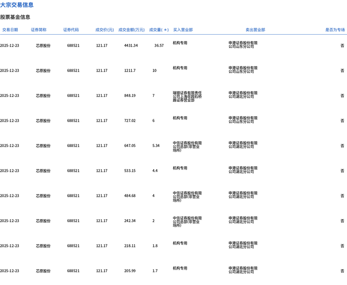 12月23日,芯原股份大宗交易成交78.81万股,成交额9549.57万元,占当日总成交额的5.52%,成交价121.17元,较市场收盘价130.41元折价7.09%。