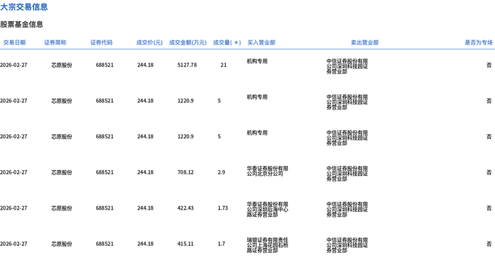 2月27日,芯原股份大宗交易成交37.33万股,成交额9115.24万元,占当日总成交额的1.37%,成交价244.18元,较市场收盘价277.66元折价12.06%。