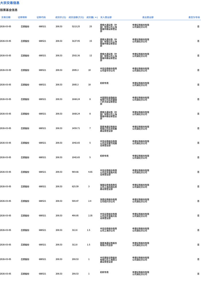 3月5日,芯原股份大宗交易成交122.4万股,成交额2.55亿元,占当日总成交额的4.17%,成交价208.53元,较市场收盘价241.08元折价13.5%。