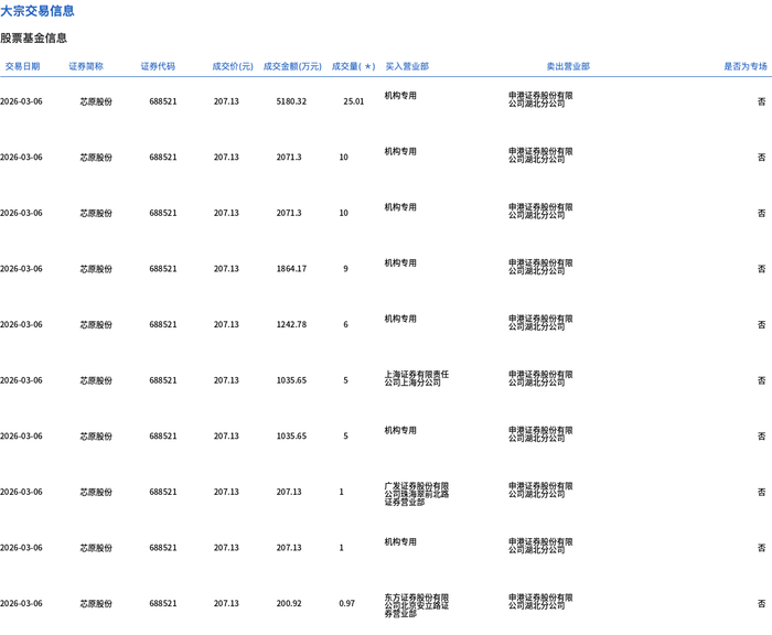 3月6日,芯原股份大宗交易成交72.98万股,成交额1.51亿元,占当日总成交额的3.81%,成交价207.13元,较市场收盘价240.85元折价14%。