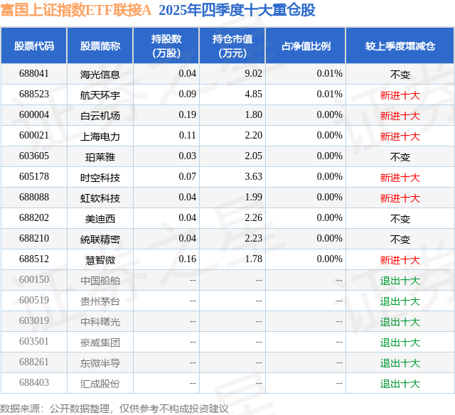 根据2025基金年报公募基金重仓股数据,重仓该股的公募基金共1家,其中持有数量最多的公募基金为富国基金的富国上证指数ETF联接A。富国上证指数ETF联接A目前规模为3.25亿元,最新净值2.0314(3月3日),较上一交易日下跌1.37%,近一年上涨26.72%。该公募基金现任基金经理为王保合 方旻。王保合在任的基金产品包括:上证综指ETF,管理时间为2011年3月3日至今,期间收益率为122.37%;富国中证国有企业改革指数(LOF)A,管理时间为2015年4月15日至今,期间收益率为12.85%;富国中证全指证券公司指数(LOF)C,管理时间为2021年8月17日至今,期间收益率为5.87%。方旻在任的基金产品包括:富国中证红利指数增强A,管理时间为2014年11月19日至今,期间收益率为225.3%;富国沪深300指数增强A,管理时间为2014年11月19日至今,期间收益率为202.13%;富国中证500指数增强(LOF)A,管理时间为2014年11月19日至今,期间收益率为192.76%;上证综指ETF,管理时间为2014年11月19日至今,期间收益率为144.27%。