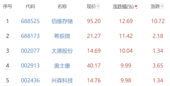 其中,佰维存储、希荻微、大港股份、奥士康、兴森科技位列板块涨幅前五位,涨幅分别为12.69%、11.42%、10.04%、9.99%、9.98%。