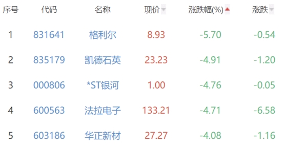 格利尔、凯德石英、*ST银河、法拉电子、华正新材位列涨幅榜后五位,涨幅分别为-5.70%、-4.91%、-4.76%、-4.71%、-4.08%。