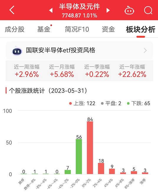 中国经济网北京5月31日讯 今日,半导体及元件板块整体涨幅1.01%,其中,122只股票上涨,2只股票平盘,65只股票下跌。