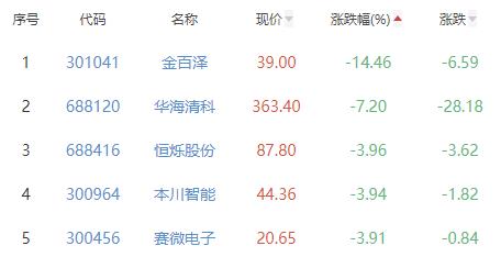 金百泽、华海清科、恒烁股份、本川智能、赛微电子位列涨幅榜后五位,涨幅分别为-14.46%、-7.20%、-3.96%、-3.94%、-3.91%。