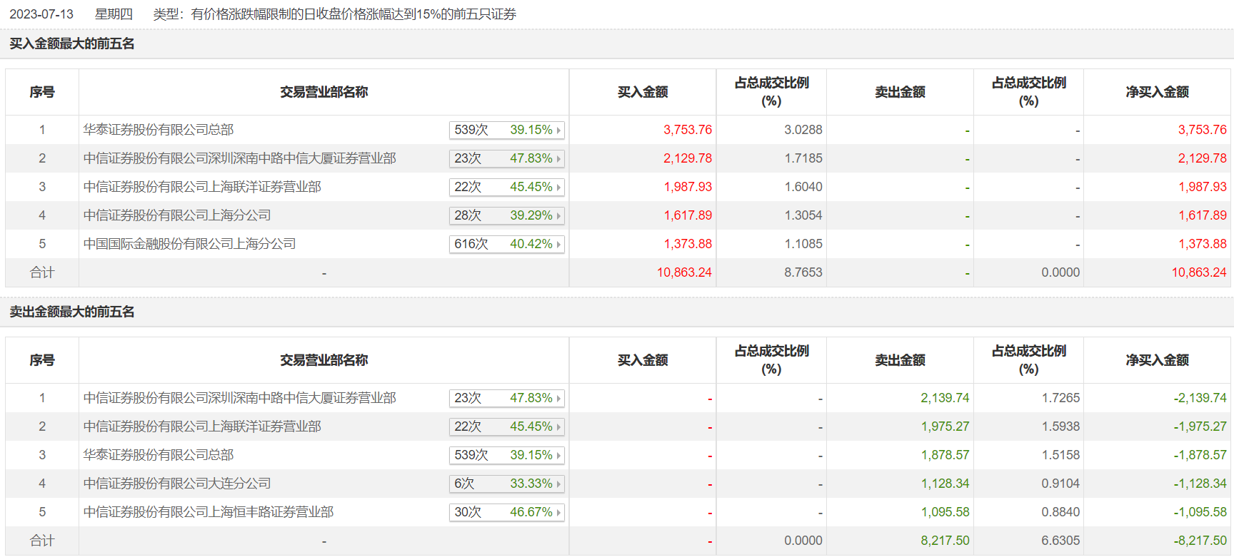 具体来看,华泰证券总部、中信证券深圳深南中路中信大厦证券营业部分别买入3753.76万元、2129.78万元;中信证券深圳深南中路中信大厦证券营业部、中信证券上海联洋证券营业部分别卖出2139.74万元、1975.27万元。