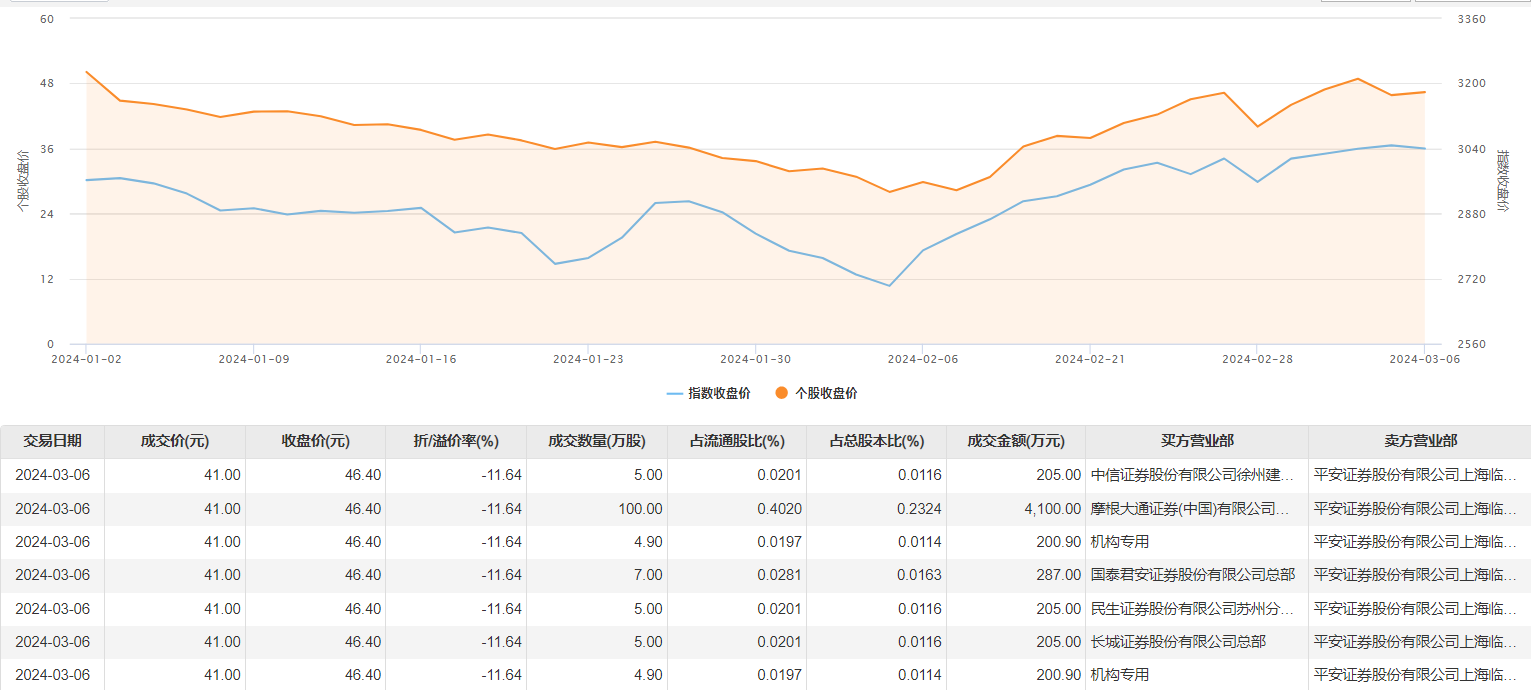 3月6日大宗交易成交131.8万股,成交额5403.8万元,占当日总成交额的5.87%,成交价41元,较市场收盘价46.4元折价11.64%。