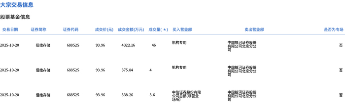 10月20日,佰维存储大宗交易成交53.6万股,成交额5036.26万元,占当日总成交额的2.02%,成交价93.96元,较市场收盘价104.05元折价9.7%。