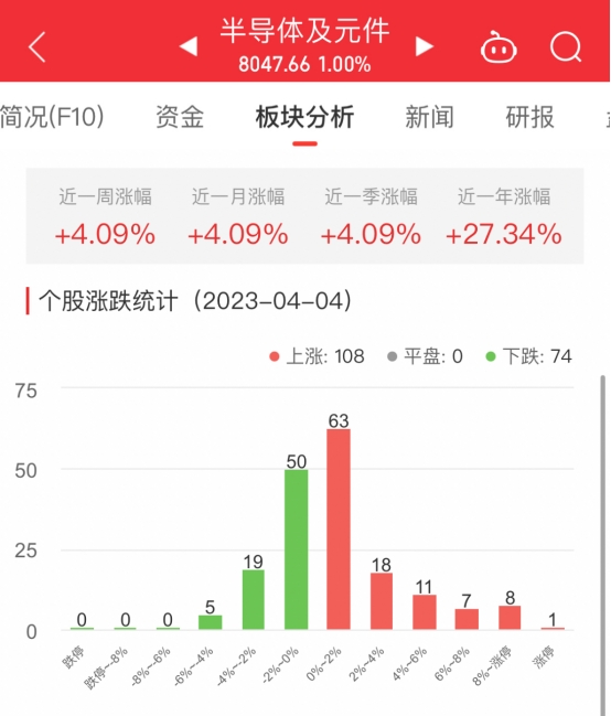 中国经济网北京4月4日讯今日,半导体及元件板块整体涨幅1.00%,其中108只股票上涨,74只股票下跌。