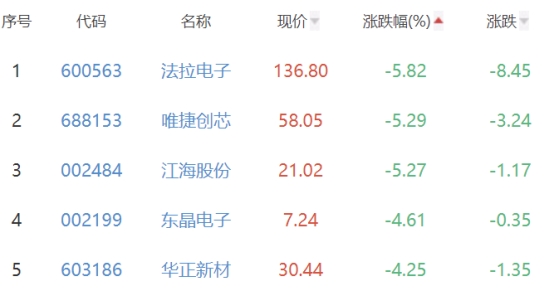 法拉电子、唯捷创芯、江海股份、东晶电子、华正新材位列涨幅榜后五位,涨幅分别为-5.82%、-5.29%、-5.27%、-4.61%、-4.25%。